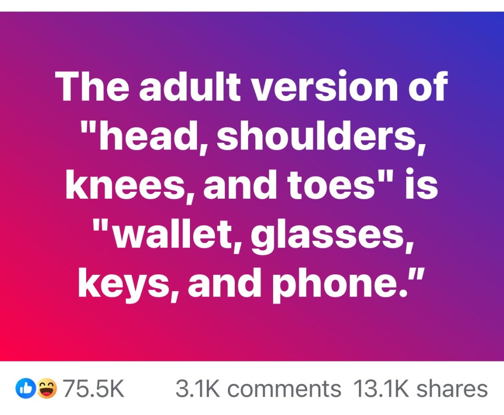 Sidenote: In my 40’s, I retooled “Head, Shoulders, Knees, and Toes” to Keys, Wallet, cell phone, purse. Alas, somebody else had the same idea and made their Instagram meme first. But it works!